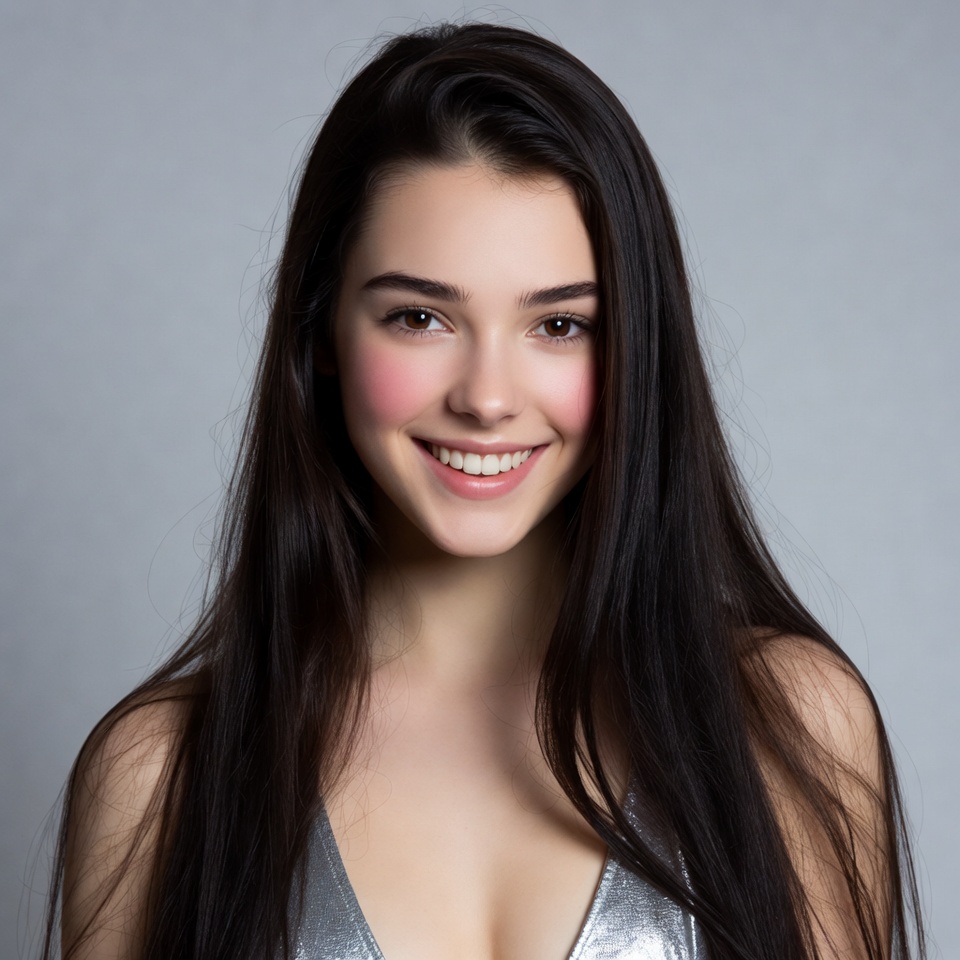 A young woman with long straight black hair smiles warmly at the camera against a plain gray background. She has striking dark eyes, flushed cheeks, and glossy lips. She wears a shiny silver dress that accentuates her figure.