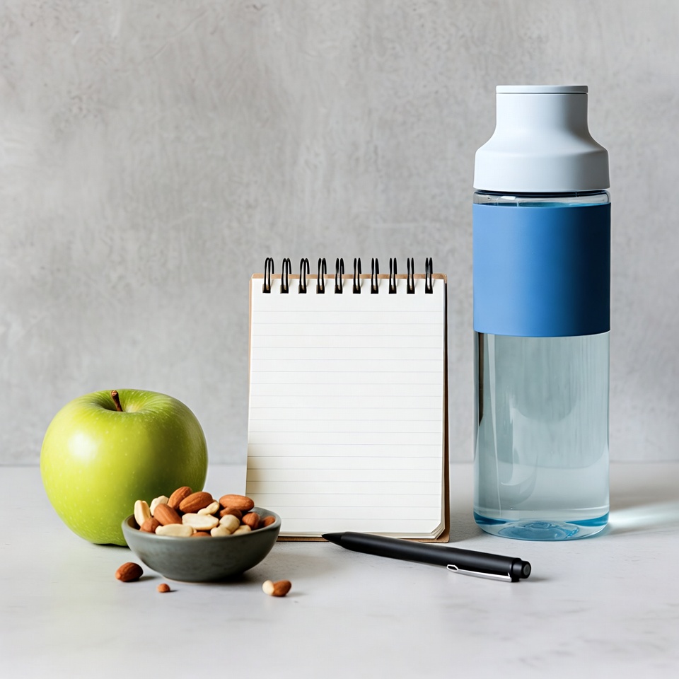 A blank open notebook with a black pen sits on a white surface next to a green apple. A gray bowl filled with mixed nuts and almonds is placed beside it, accompanied by a tall blue and white water bottle containing clear water. The items are arranged on a light gray background.