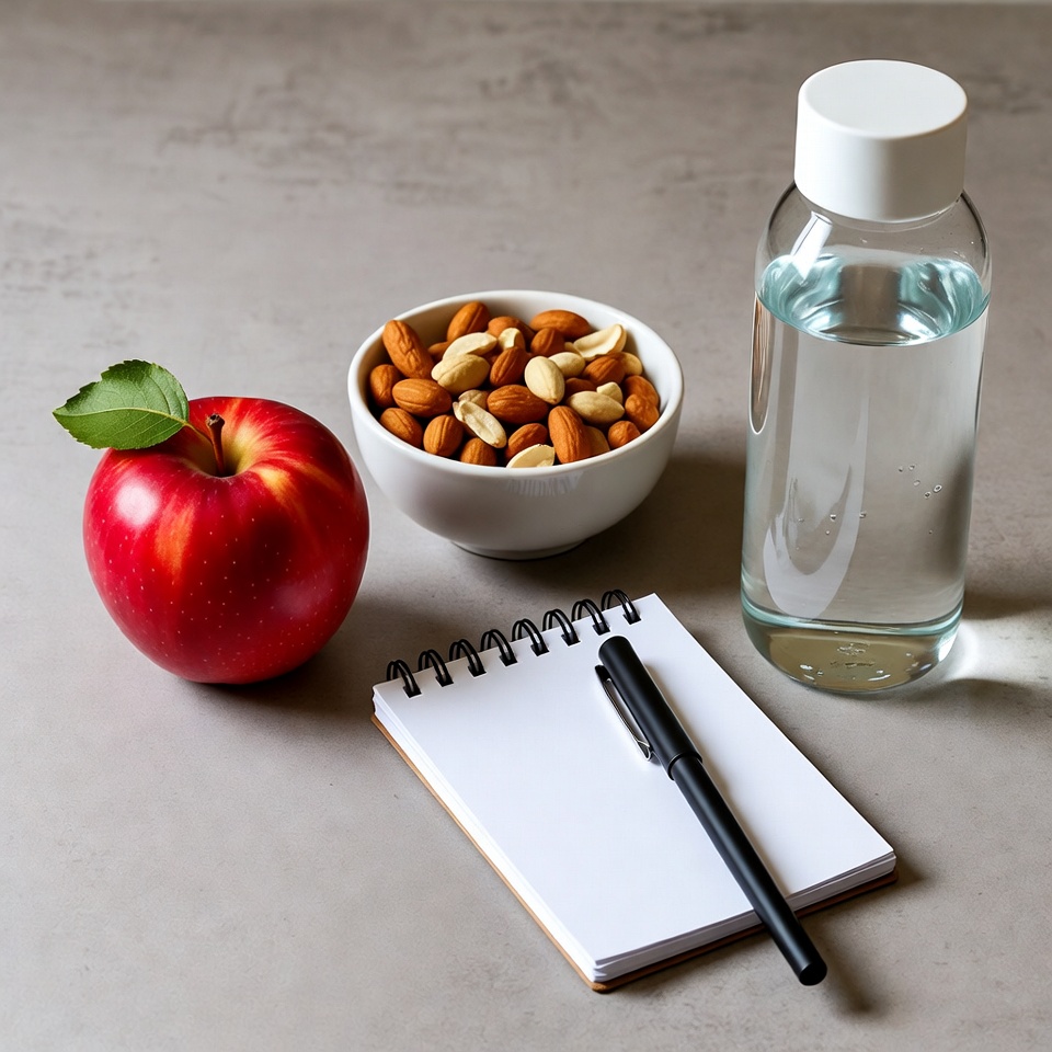 A vibrant red apple with a green leaf sits on a gray surface next to a white bowl filled with almonds. A clear glass bottle of water and an open spiral notebook with a black pen are placed beside them. The items are arranged simply on a textured gray background.