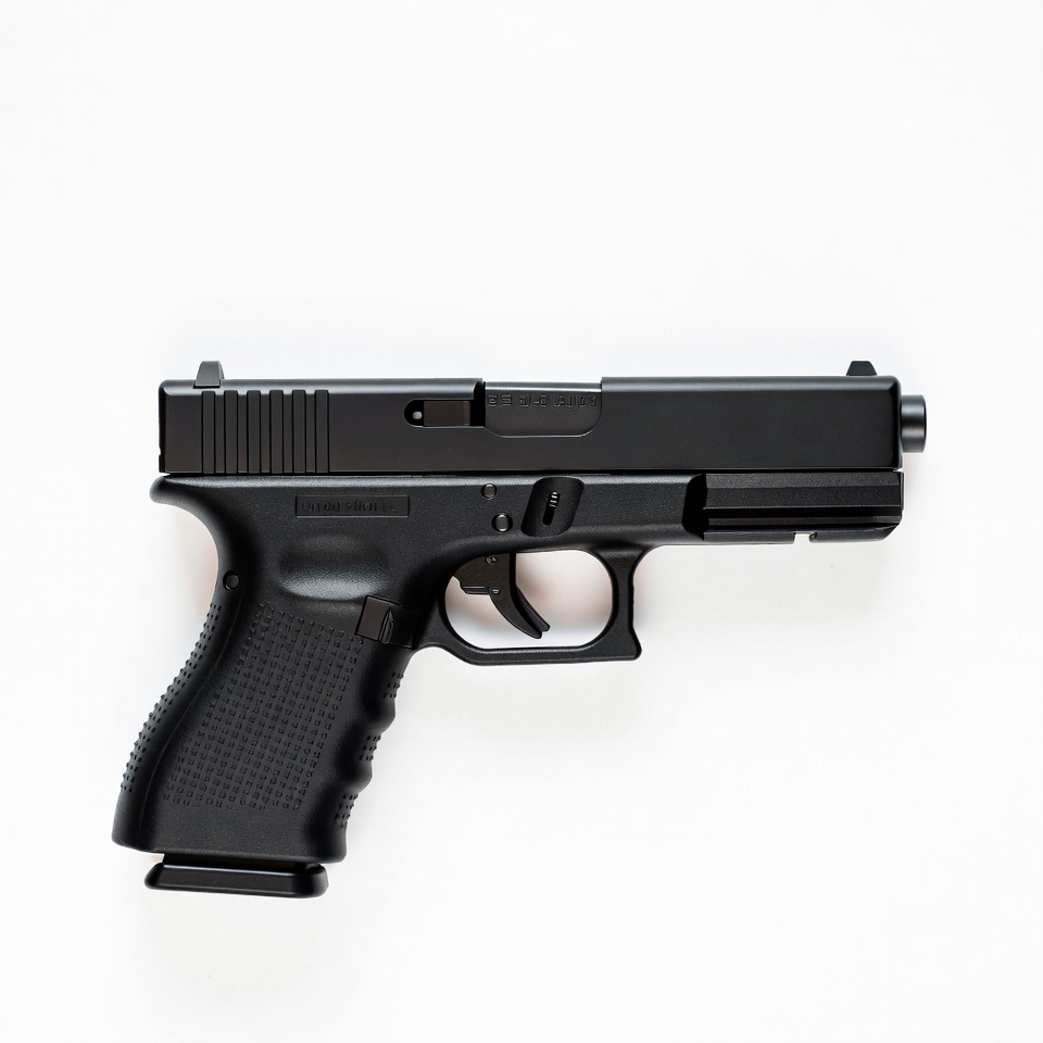 9mm, black gun, combat pistol, firearm, firepower, gun control, handgun, isolated, matte black, pistol grip, police weapon, self-defense, semi-automatic, shooting, slide, suppressor, tactical gun, weapon, white background, Glock pistol