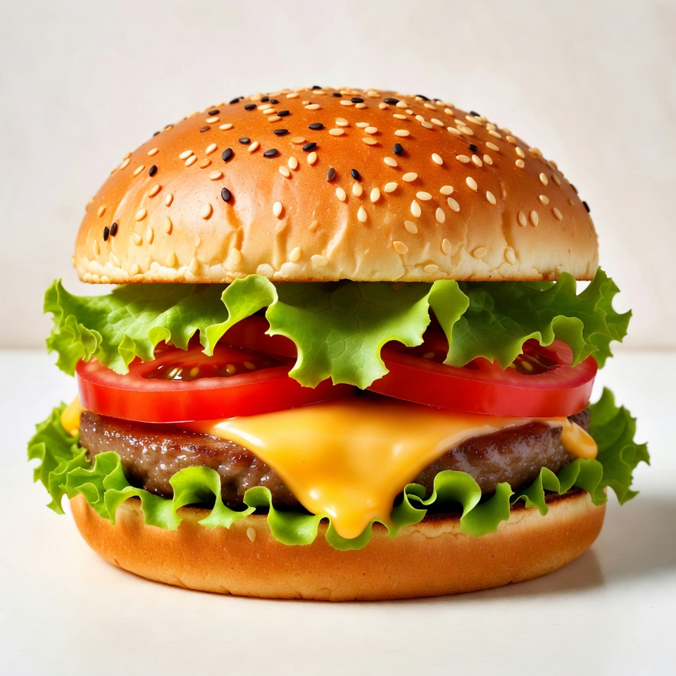 beef burger, beef patty, burger, cheese, cheese slice, fast food, food, fresh, gourmet burger, green lettuce, grill marks, hamburger, isolated background, juicy, layered sandwich, lettuce, meal, red tomato, sesame bun, stacked burger, tomato, white background, cheeseburger