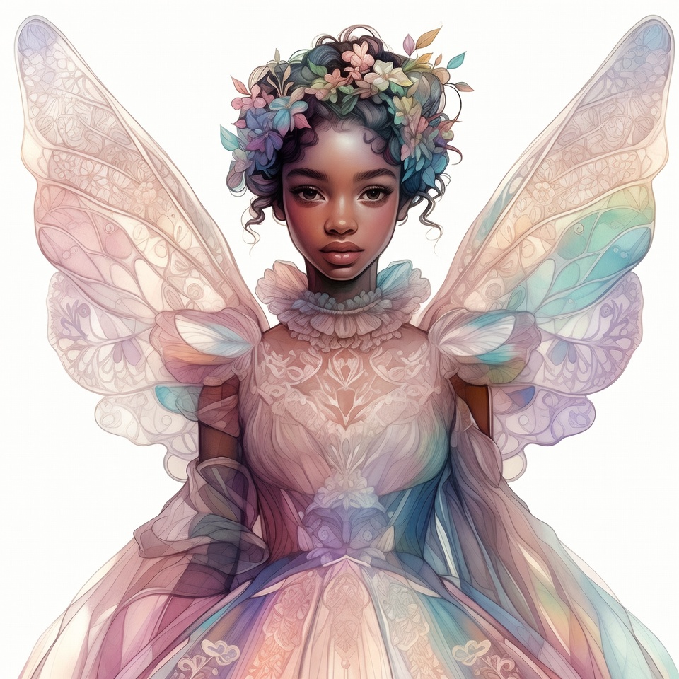 African-American, beautiful fairy, colorful wings, curly hair, digital art, elegant gown, fairy girl, fairy wings, fantasy, fantasy character, floral crown, flowers, illustration, isolated background, lace gown, magical, pastel dress, portrait, translucent wings, wings, woman, young woman, fairy