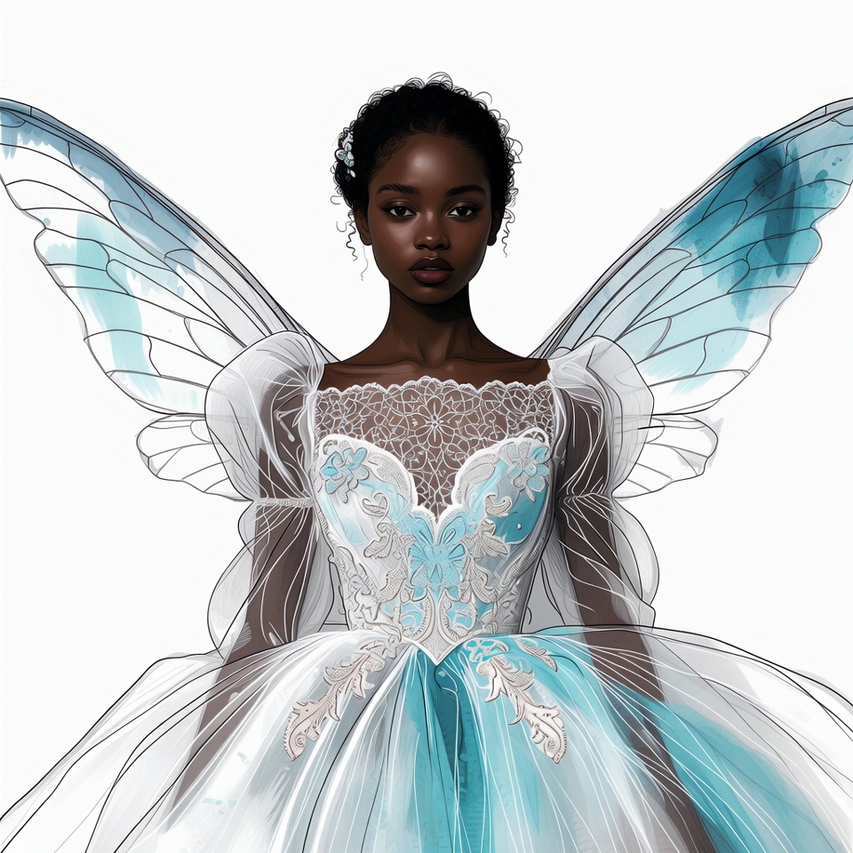 A beautiful African-American woman with curly hair and striking features stands with large translucent blue fairy wings spread behind her. She wears an elegant white lace gown with blue accents and a full skirt. The digital illustration is set against an isolated white background.