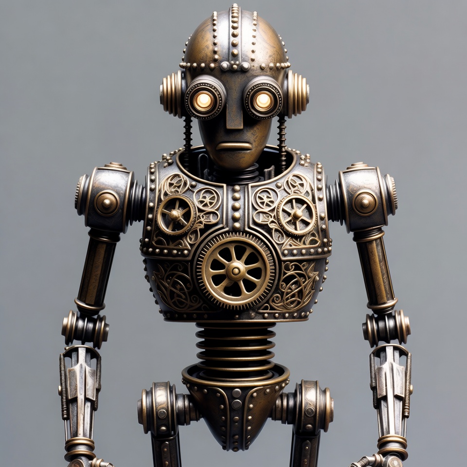 automaton, brass robot, bronze robot, gears, glowing eyes, gray background, humanoid robot, isolated background, mechanical, metallic body, rivets, robot, sci-fi robot, steampunk, vintage robot, yellow eyes, steampunk robot