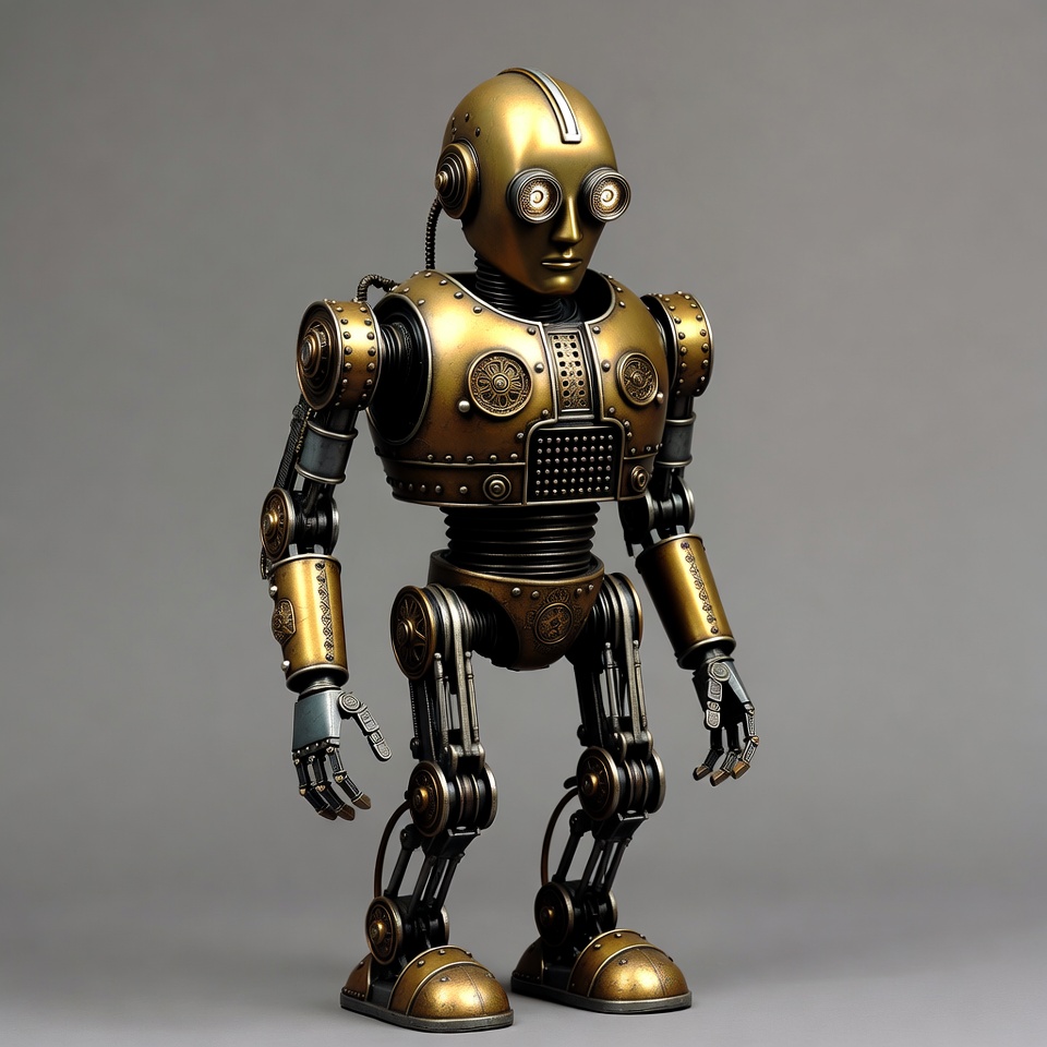 bronze robot, gears, goggles, gold robot, humanoid robot, isolated background, machinery, mechanical robot, retro robot, rivets, robot, standing robot, steampunk, vintage robot, steampunk robot