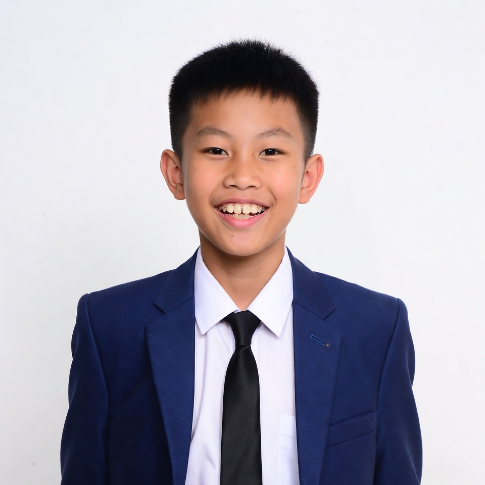 Asian, Asian boy, black hair, black tie, dress shirt, formal wear, happy smile, headshot, isolated background, male, navy suit, portrait, short hair, smiling boy, studio photo, suit jacket, white shirt, young boy, boy