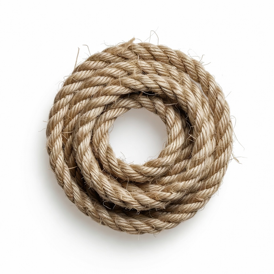 brown rope, circle, coiled rope, hemp rope, isolated background, loop, nautical rope, thick rope, top view, twisted rope, white background, rope