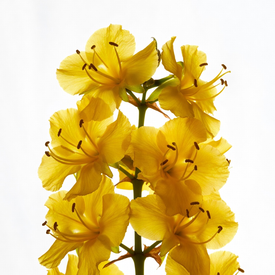 A cluster of vibrant yellow forsythia flowers blooms on a tall stem. The petals are delicate and slightly translucent with fine reddish-brown stamens. The flowers are isolated against a plain white background.