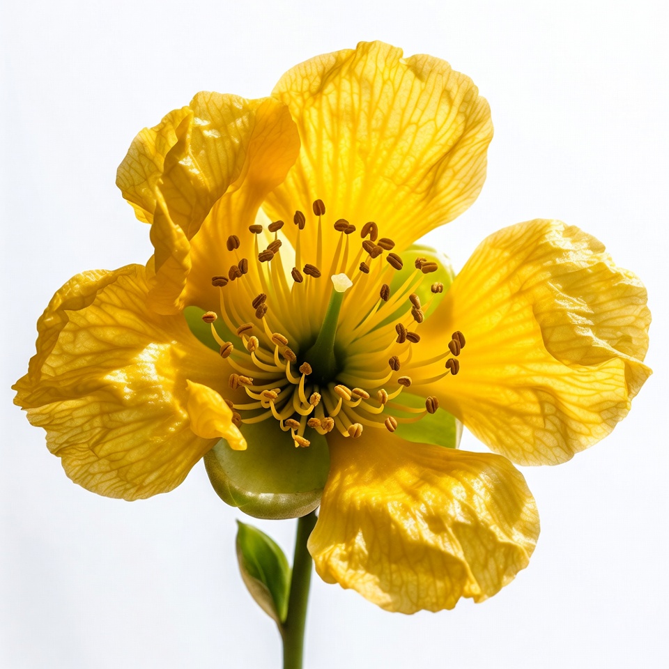 A vibrant yellow flower with ruffled petals and prominent brown stamens is centered against a white background. A small green bud and stem extend from the base of the flower. The petals have a textured, veined appearance.