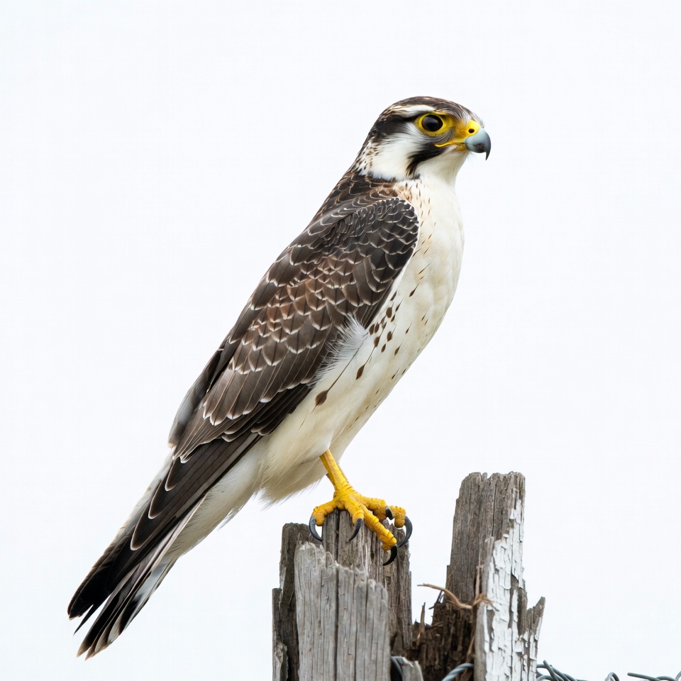 beak, bird, bird of prey, brown feathers, falcon, feathers, isolated background, nature, perched, raptor, sharp eyes, talons, white feathers, wildlife, wooden post, yellow beak, yellow talons, peregrine falcon