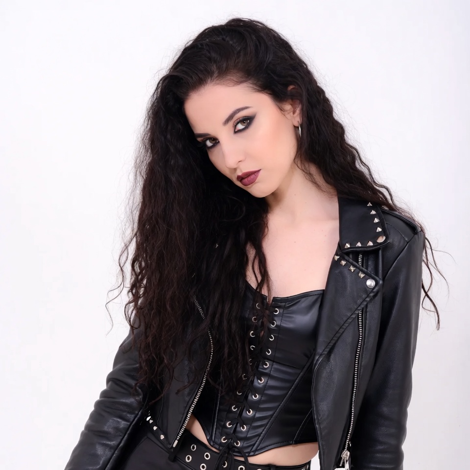 A young woman with long wavy black hair poses sideways against a white background. She wears a black leather jacket with studs and laces, paired with a corset top. Her makeup features dark eyeliner and deep red lipstick.