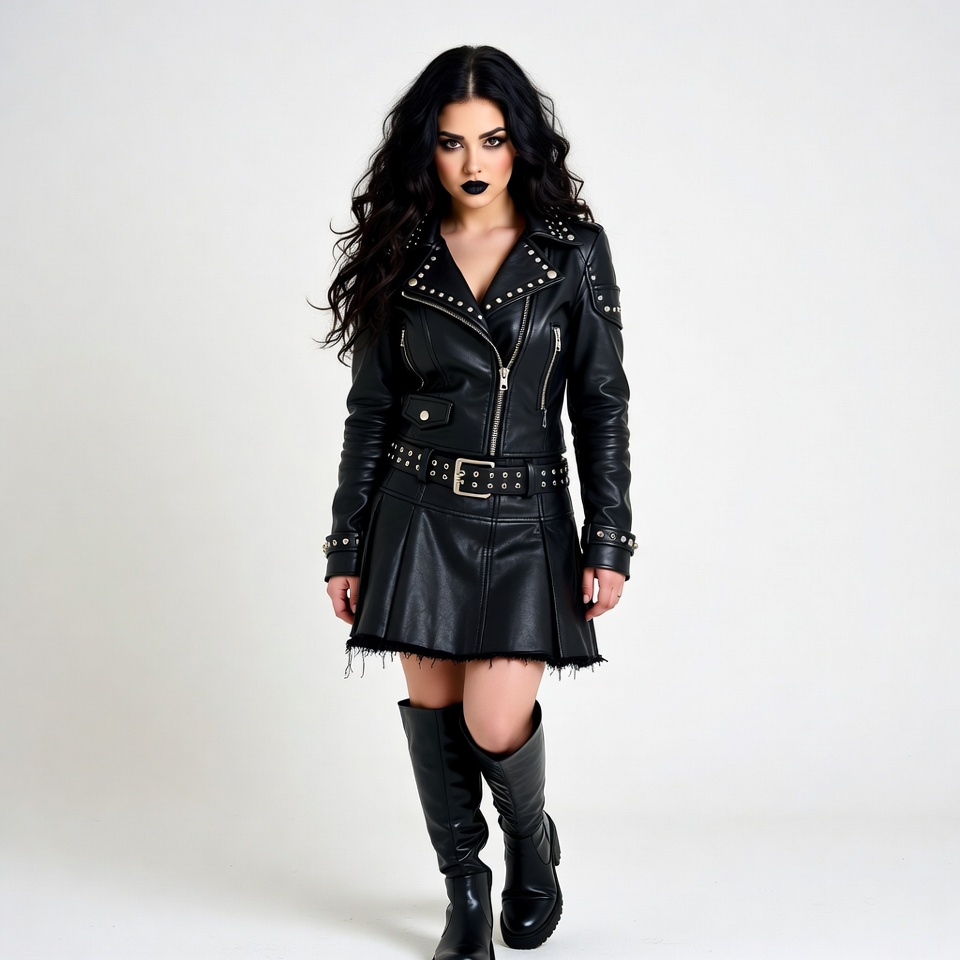 A woman with long dark wavy hair and dark makeup stands confidently on a white background. She wears a black leather biker jacket with studs, a short fringed leather skirt with a belt, and tall black boots. Her outfit features prominent zippers and edgy details.