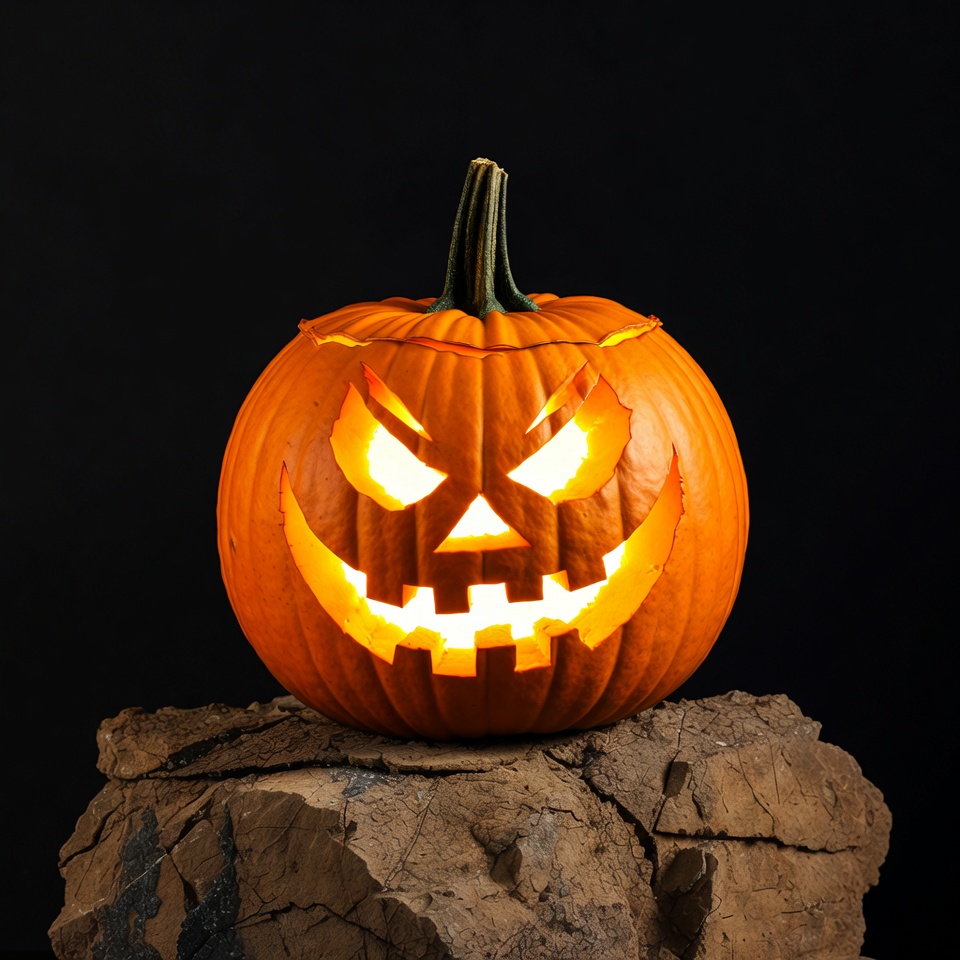 Halloween, Halloween decoration, Halloween lantern, carved pumpkin, dark background, glowing eyes, glowing face, green stem, isolated, jack o lantern, jagged teeth, lit pumpkin, orange pumpkin, pumpkin, pumpkin face, rock surface, scary face, spooky pumpkin, stone base, jack-o-lantern