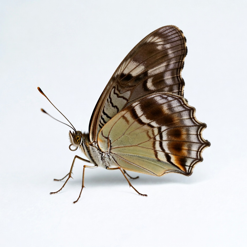 A butterfly with brown and white striped wings is perched on a plain white background. Its wings feature intricate patterns of brown, white, and yellow hues with scalloped edges. The butterfly displays its upper wings partially open, revealing detailed veins and markings.