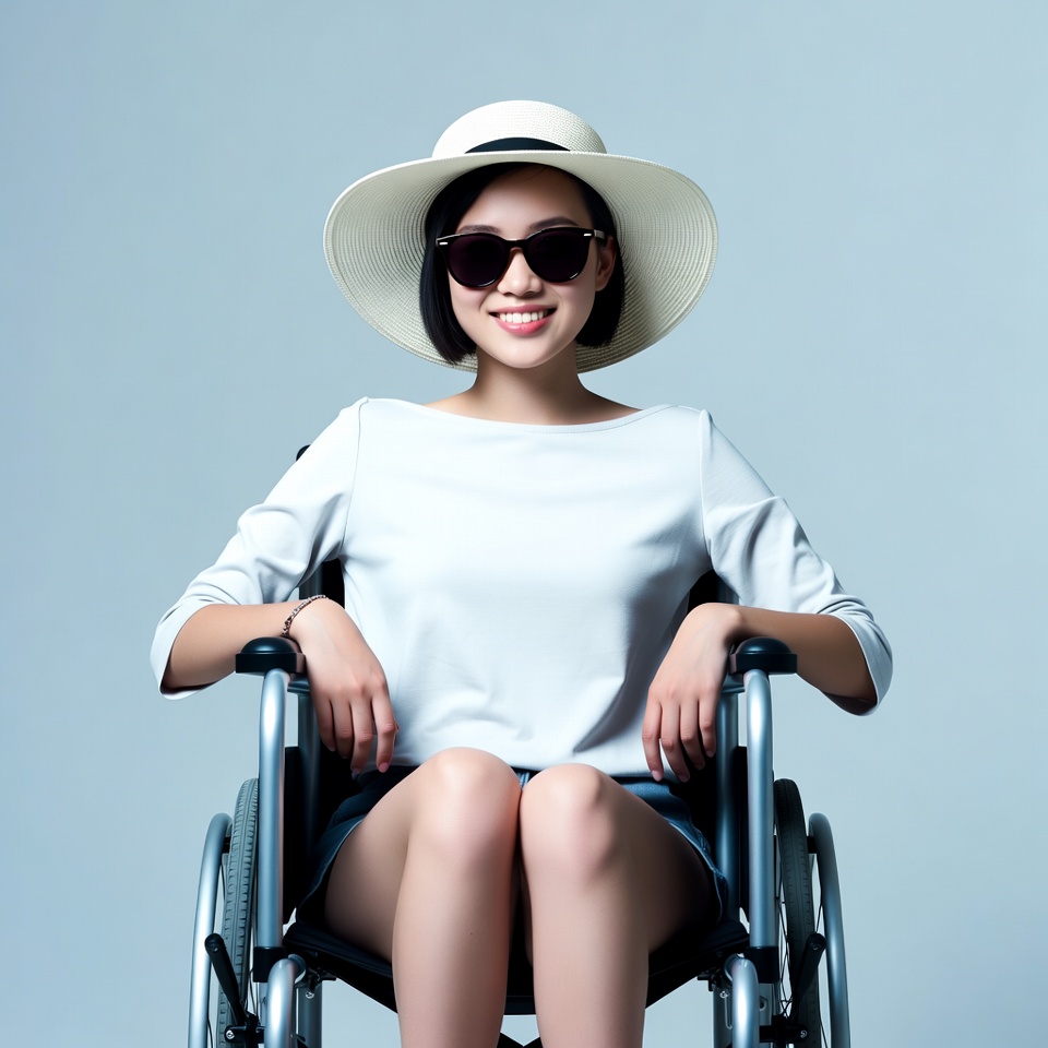 A young Asian woman with short bob hair sits smiling in a wheelchair against a plain light blue background. She wears a wide-brimmed white sun hat, dark sunglasses, a white off-shoulder top, and a short skirt. Her hands rest on the wheelchair arms as she poses confidently.