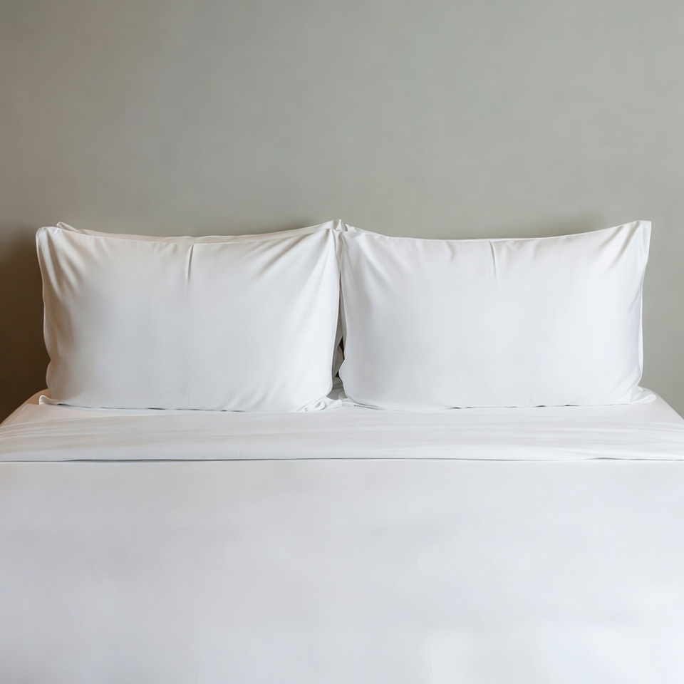 A neatly made bed features crisp white sheets and two large white pillows propped against a light gray headboard. The bed sits in a minimalist room with smooth gray walls. The scene is clean and simple with no other objects visible.