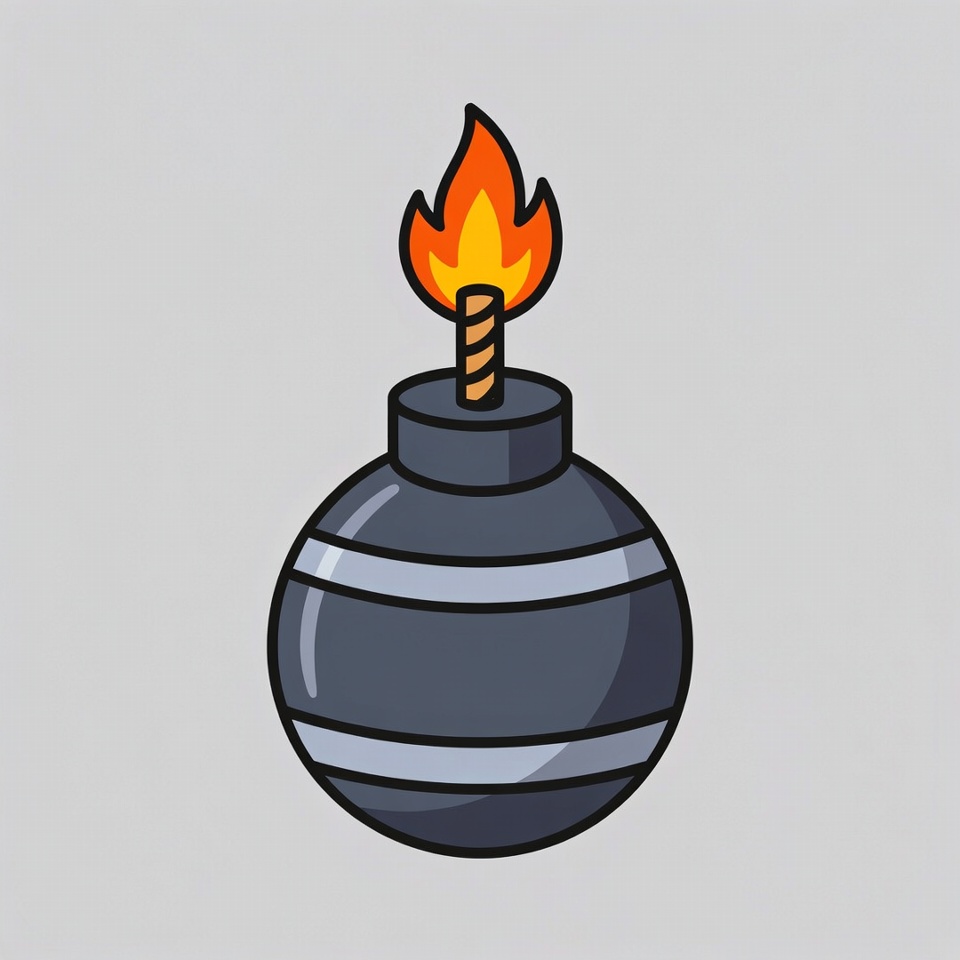A black cartoon bomb with white stripes sits on a gray background. A lit orange fuse with flames extends from the top of the bomb. The illustration features bold outlines and vibrant colors.