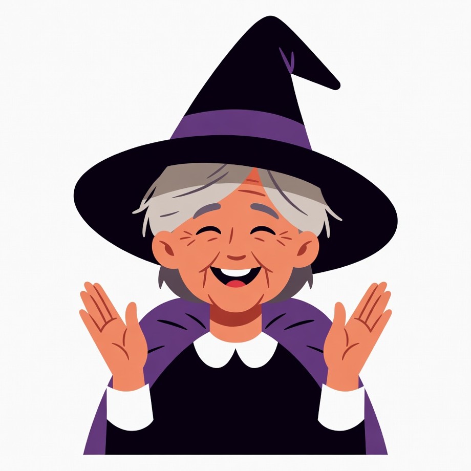 A cartoon elderly woman with gray hair wears a tall black witch hat and purple cape over a black collared dress. She has a joyful expression with wide smile and crinkled eyes, raising both hands in excitement. The illustration features a clean white background.