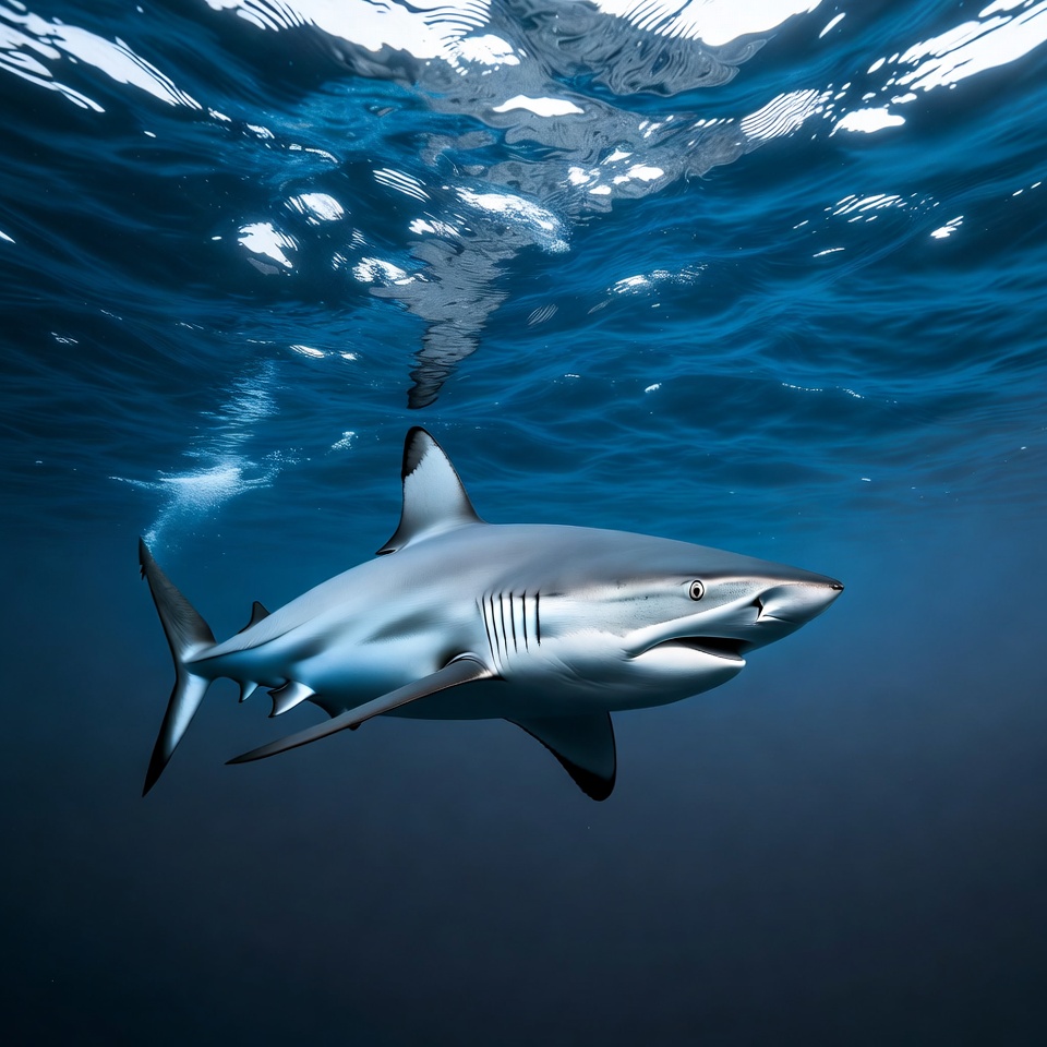 aquatic, black fins, blue water, bubbles, clear water, deep sea, fins, fish, gray shark, marine life, ocean, ocean animal, predator, sea, shark, shark fin, sunlight reflection, swimming, underwater, wildlife, blacktip shark
