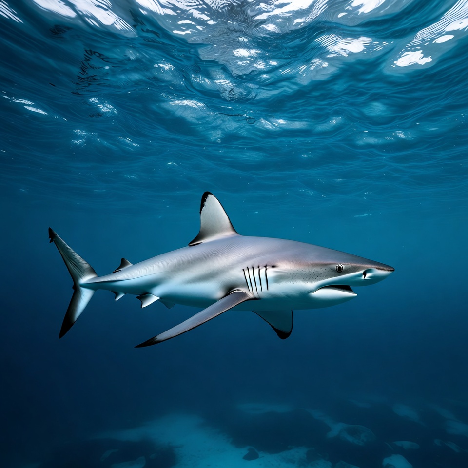 A blacktip shark glides through clear blue ocean water. Its sleek body features distinctive black tips on the fins, with rippling water surface above. The shark faces forward with an open mouth, surrounded by turquoise depths.