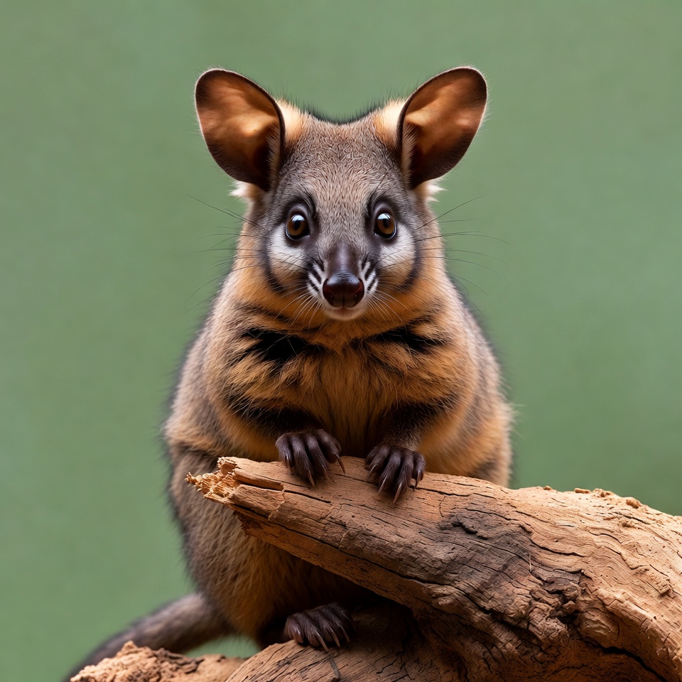 A quoll with large ears, dark eyes, and a pointed snout sits on a wooden log. Its fur is brown with lighter patches on the chest and face. The animal faces forward against a green background.