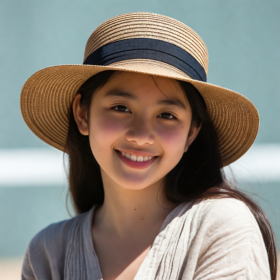 A young Asian girl with long dark hair smiles warmly at the camera while wearing a wide-brimmed straw hat with a black band. She has on a light beige tunic and stands against a teal background. Her face shows rosy cheeks and bright eyes.