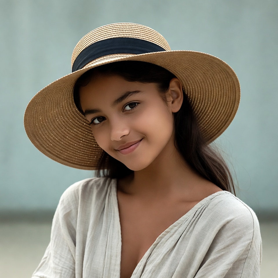 A young girl with long dark hair smiles at the camera while wearing a wide-brimmed straw hat with a black band. She has expressive brown eyes and is dressed in a loose white linen top. The image features a solid blue background.