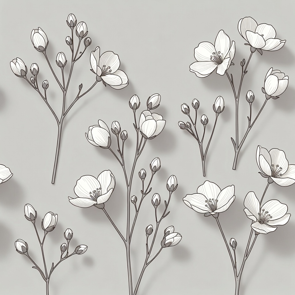 blossoms, botanical illustration, branches, buds, clipart, delicate flowers, elegant blossoms, floral pattern, flower buds, flower stems, gray backdrop, gray background, illustration, isolated background, line art, petals, simple flowers, stems, white petals, white flowers
