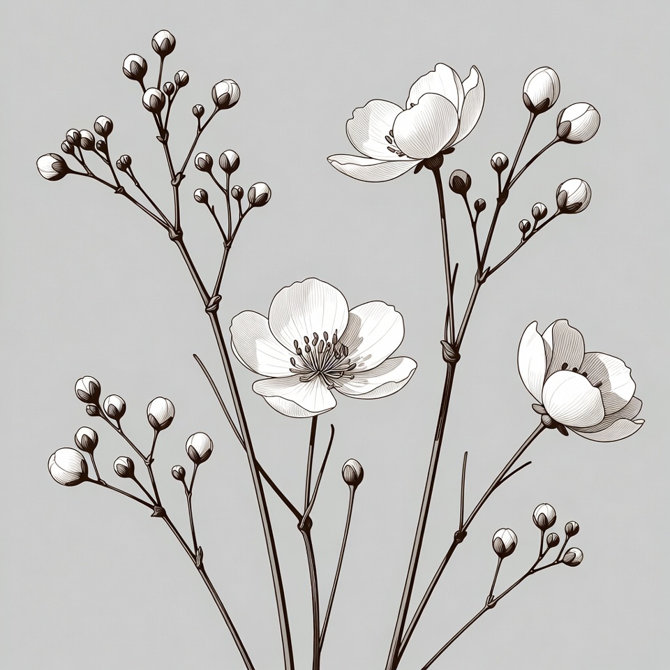 A detailed line art illustration features several white flowers with delicate petals and numerous small buds on thin stems. The artwork is rendered in grayscale tones against a light gray background. The composition highlights the intricate branching stems and blooming flowers.