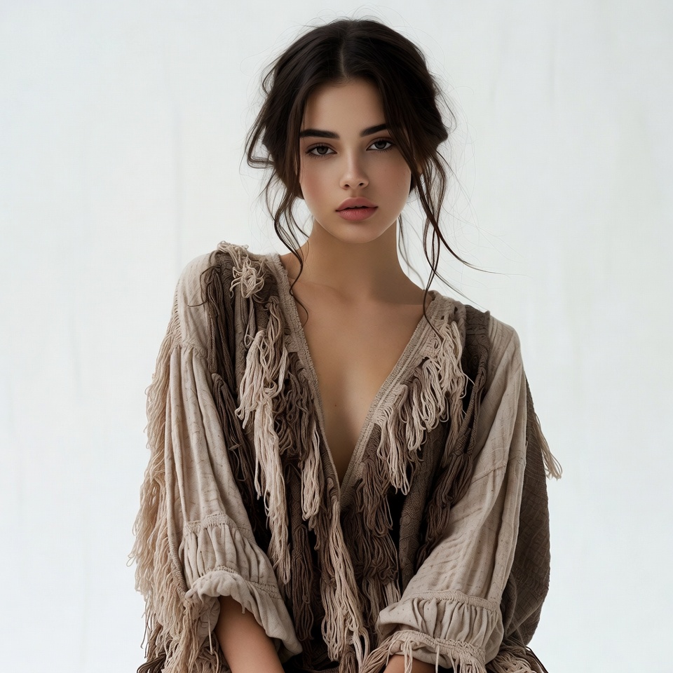 A young woman with long dark brown hair styled in a loose updo stands against a white background. She wears a beige fringed dress with a deep V-neckline and flowing fringe details on the sleeves and hem. Her expression is neutral with subtle makeup.