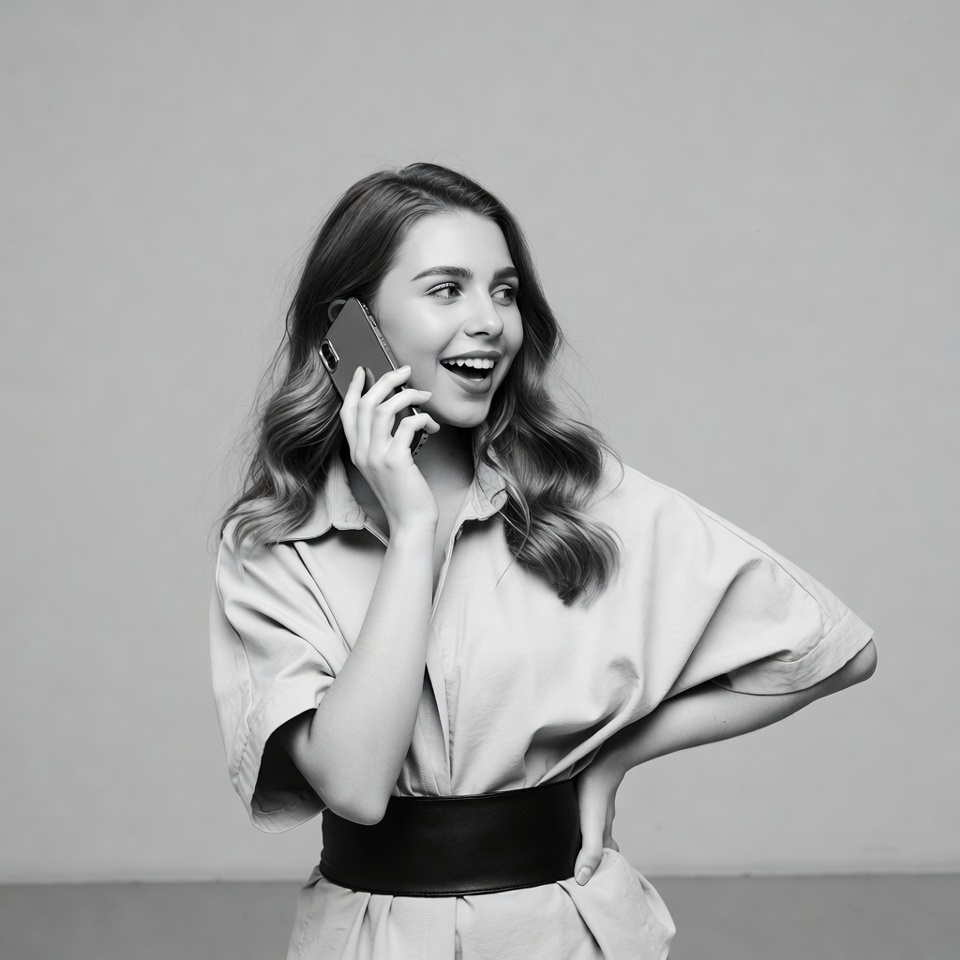 A young woman with long wavy hair smiles excitedly while talking on her smartphone. She wears a loose beige shirt with a wide black belt and stands against a plain gray background. Her expression is joyful as she holds the phone to her ear.