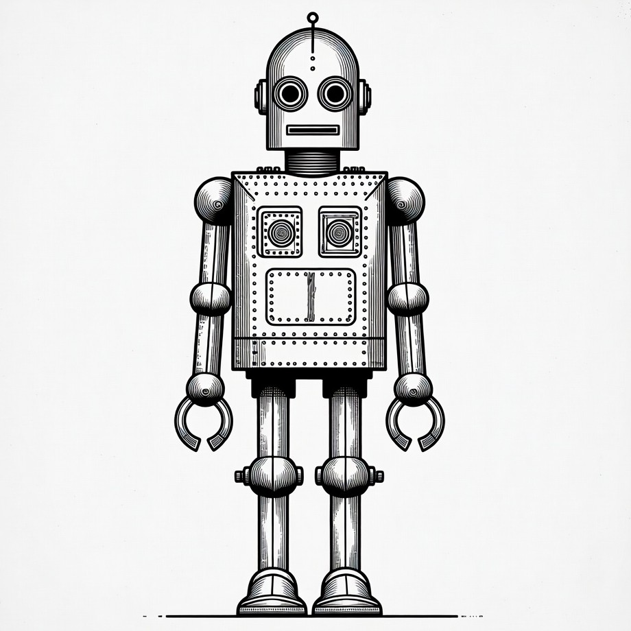 A detailed black and white illustration of a classic silver robot stands on a plain background. The robot features a rounded head with antenna, large round eyes, riveted metal body panels, and mechanical arms with claw hands. It has sturdy legs and a retro futuristic design.