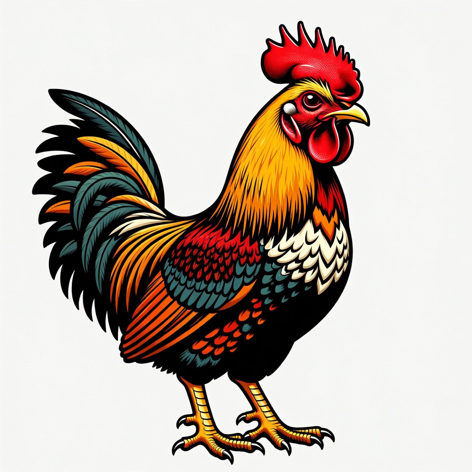 A vibrant, detailed illustration of a rooster stands on a white background. The rooster features a bright red comb and wattle, golden feathers with multicolored patterns on its neck and wings, and black tail feathers. Its sharp beak and legs add to the striking, artistic design.