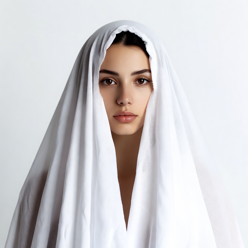 A young woman with dark hair and brown eyes gazes directly at the camera. She wears a white headscarf draped over her head and shoulders against a plain white background. Her expression is calm with subtle makeup on her lips and eyes.