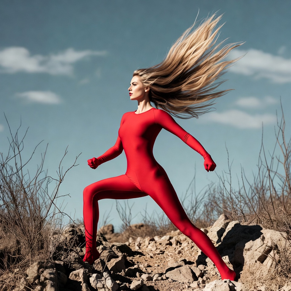 White, action pose, arms outstretched, athletic, blonde hair, blue sky, clouds, dry bushes, dynamic pose, female, fitness, flowing hair, legs extended, long hair, outdoors, powerful stance, red bodysuit, rocky terrain, superhero pose, tight clothing, woman