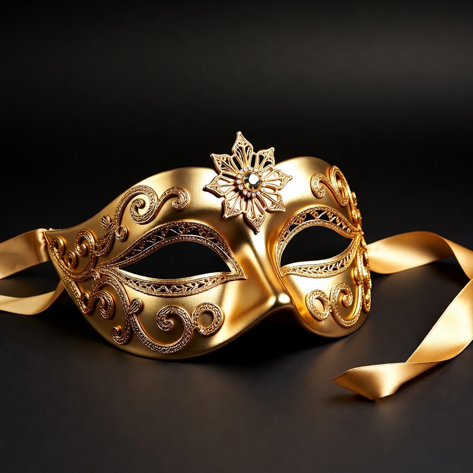 An ornate gold masquerade mask with intricate filigree patterns and a sparkling star-shaped jewel at the center. It features curved eye openings and elaborate scrollwork along the edges. Golden ribbons hang from both sides against a solid black background.