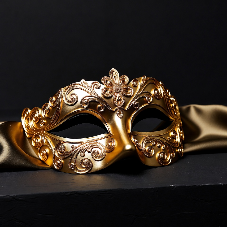 A ornate gold masquerade mask with intricate floral designs and swirling patterns rests on a black surface. Gold ribbons drape from the sides, adding elegance. The mask features eye openings and detailed embellishments against an isolated black background.