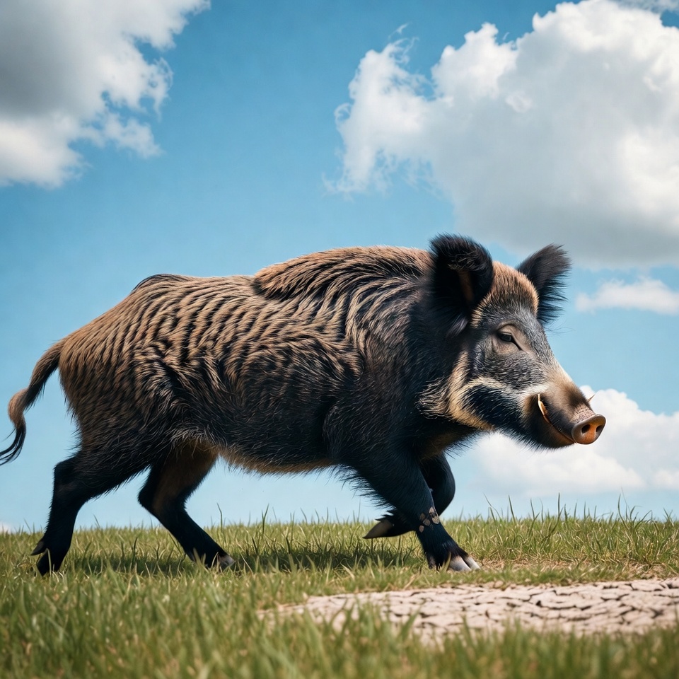 animal, blue sky, boar, bristly fur, brown fur, clouds, field, fur, grass, hooves, isolated background, mammal, nature, outdoors, running, tail, tusks, wildlife, wild boar
