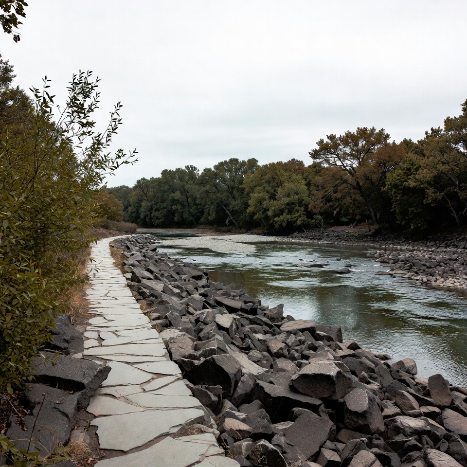 Stone Path Along River with Riprap