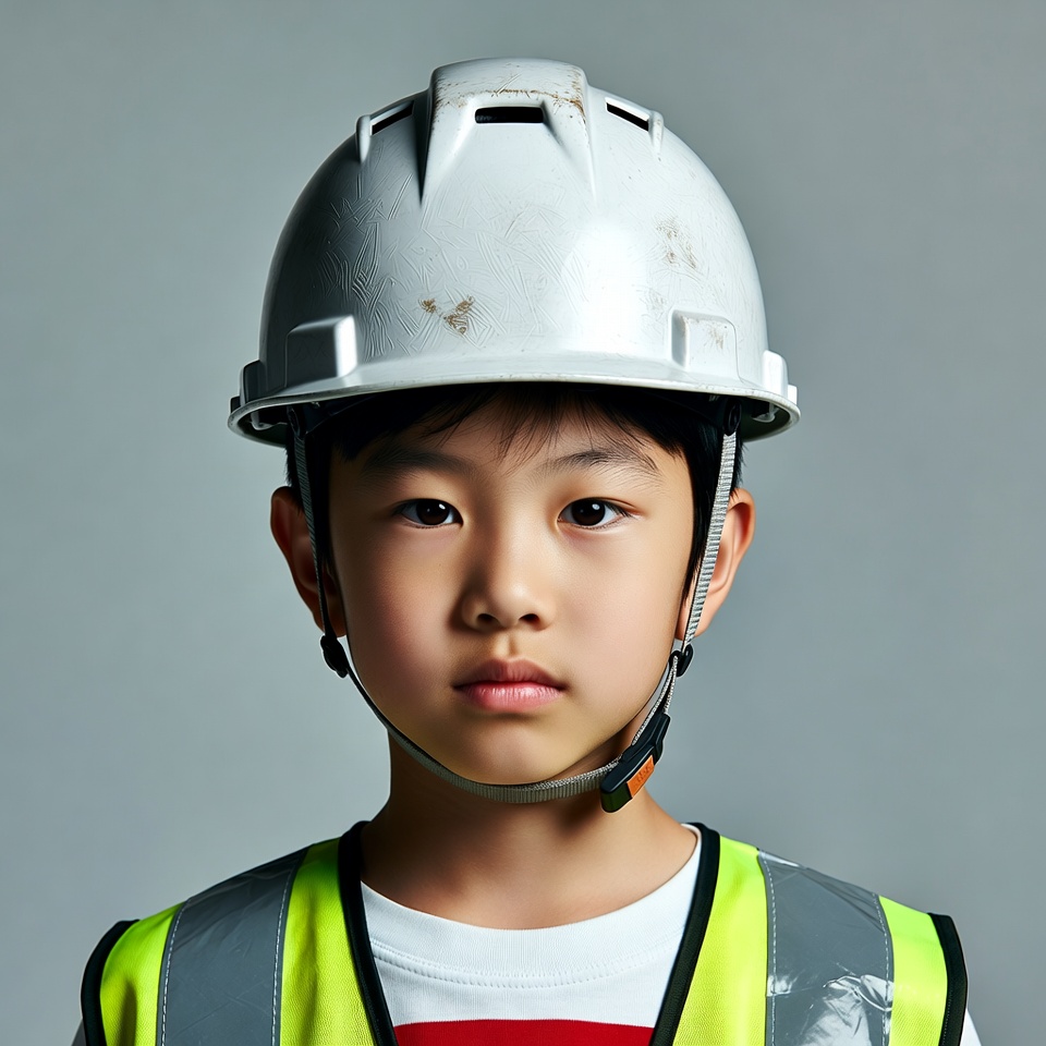 Asian, Asian boy, child, construction helmet, face, gray background, hard hat, kid, male, portrait, protective gear, red stripes, safety gear, safety helmet, safety vest, white shirt, worker outfit, yellow vest, young boy, boy