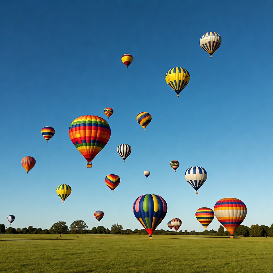 aerial view, aviation, ballooning, balloons flying, blue balloon, blue sky, colorful balloons, field, floating balloons, grass, green field, hot air balloon festival, landscape, multicolor balloon, orange balloon, outdoor scene, purple balloon, red balloon, sky, striped balloons, sunny day, trees, vibrant colors, yellow balloon, hot air balloons