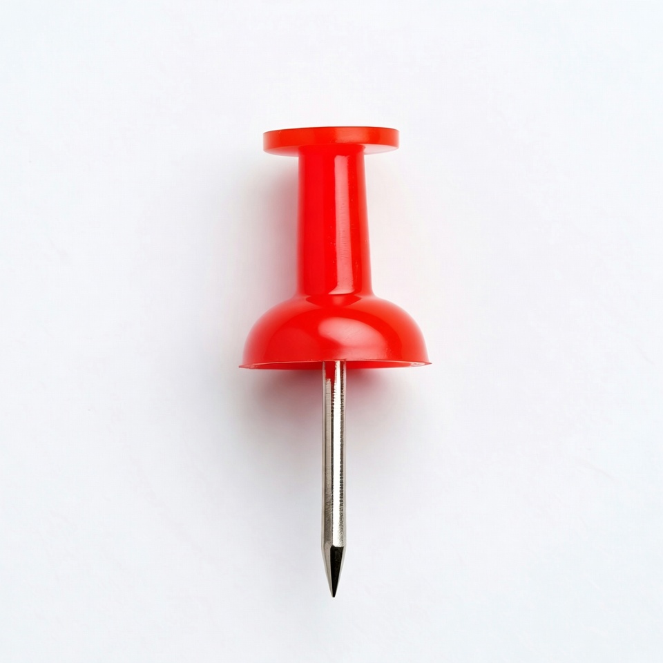 bulletin board pin, isolated, metal pin, office supply, pin, plastic head, red, red pin, sharp point, stationery, thumbtack, white background, push pin
