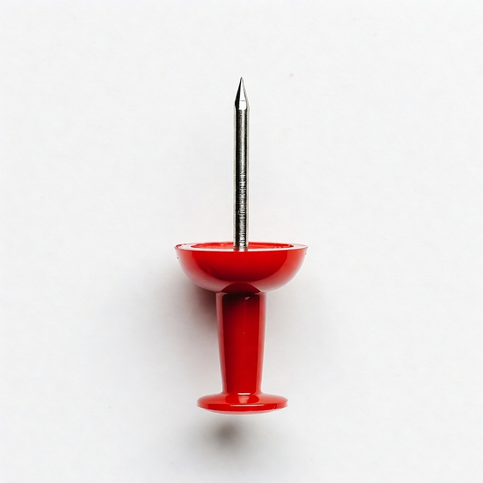 A red plastic push pin with a silver metal point stands vertically on a white background. The pin has a rounded red head and a thin shaft. It is centered and isolated against the plain white surface.