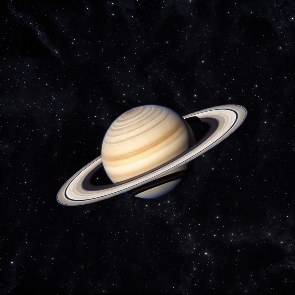 Saturn floats in the blackness of outer space surrounded by distant stars. The gas giant features tan and beige banded clouds and prominent icy rings tilted at an angle. The detailed planetary rings encircle the equator against the starry background.