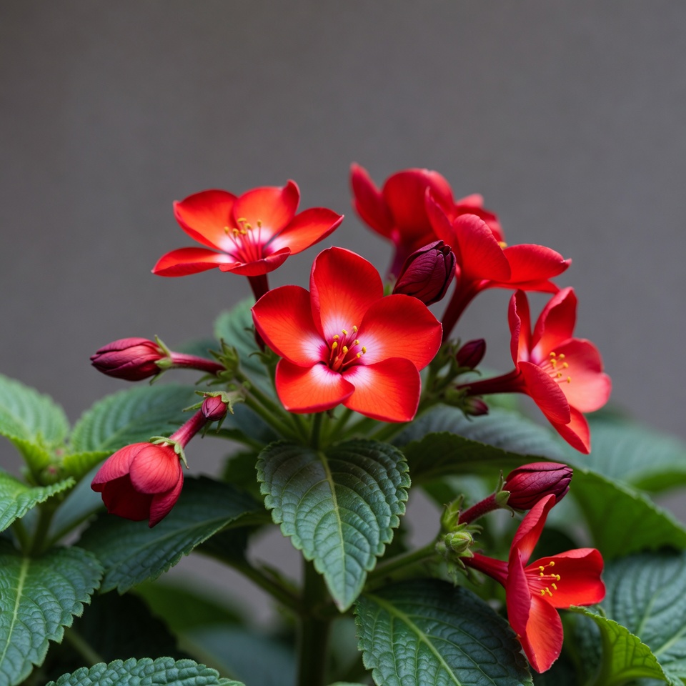 blooming flowers, closeup flowers, flower buds, flower cluster, garden plant, green leaves, plant, red buds, red flowers, serrated leaves, tropical plant, vibrant red, yellow centers, hibiscus