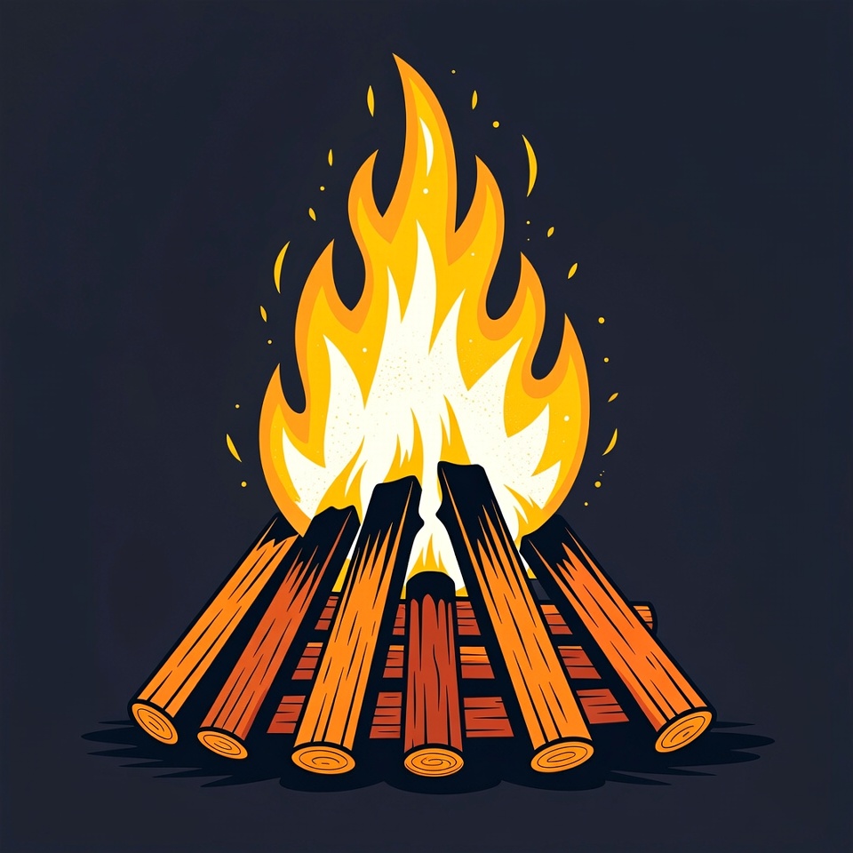 bonfire, burning wood, cartoon, clipart, dark background, fire, flames, glowing fire, graphic, illustration, isolated, logs, orange flames, outdoor fire, sparks, teepee fire, vector art, wood, yellow fire, campfire