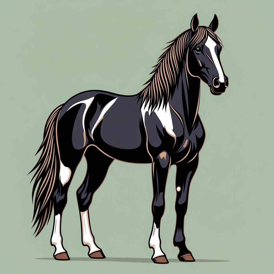 animal, black and white horse, clipart, digital illustration, equine, flowing tail, illustration, isolated background, long mane, paint horse, standing horse, vector art, white markings, horse