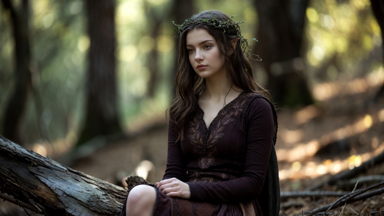 A young woman with long wavy brown hair and a green flower crown sits on a mossy log in a dense forest. She wears a long-sleeved maroon lace dress with a low neckline and gazes thoughtfully ahead. Sunlight filters through the green trees surrounding her.