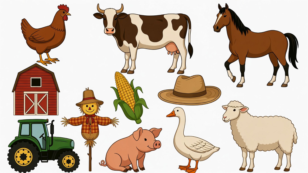 animals, barn, brown horse, cartoon, chicken, clipart, corn, cow, farm, goose, green tractor, hat, horse, illustration, isolated background, pig, pink pig, red barn, scarecrow, sheep, tractor, white sheep, farm animals