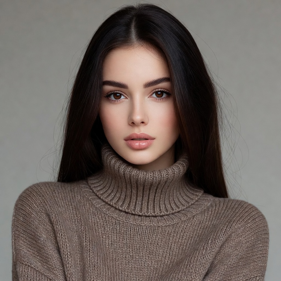 beautiful woman, beige sweater, black hair, closeup, female, gray background, headshot, long hair, makeup, pink lips, portrait, serious expression, straight hair, sweater, turtleneck, young woman, woman